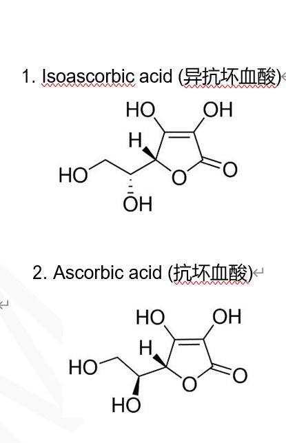 抗壞血酸與異抗壞血酸是一對(duì)光學(xué)異構(gòu)體。抗壞血酸是一種營(yíng)養(yǎng)強(qiáng)化劑,藥用為多。異抗壞血酸,多用于食品與化妝品中,作為防腐劑用。