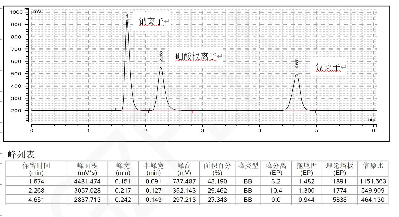 斥作用沒有保留,可以確保硼酸根離子不受干擾。可以通過調節緩沖鹽比例來調節保留,當緩沖鹽濃度降低時,鈉離子出峰更快,而硼酸根離子和氯離子保留增強;也可以通過改變 pH 來調節三者的保留。