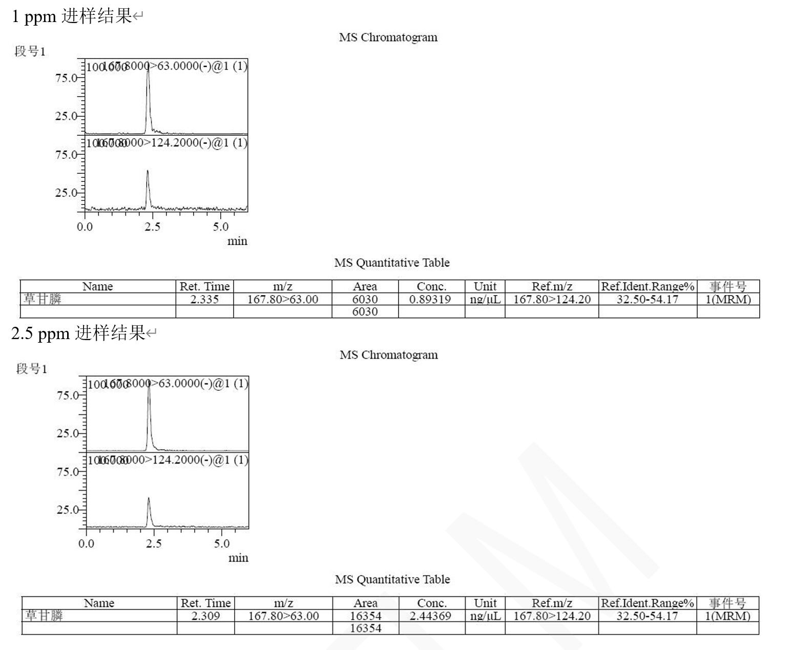 說明:本方法研究草甘膦不衍生直接檢測。相比于傳統衍生后用 C18 分析,或者用氨基柱不衍生 PH=10-11 條件下分析,帶來的復雜,耗時,以及氨基柱結果重現與壽命上的問題。此方法簡單,快速,方便。可滿足常規分析檢測需求以及多數殘留檢測需求。