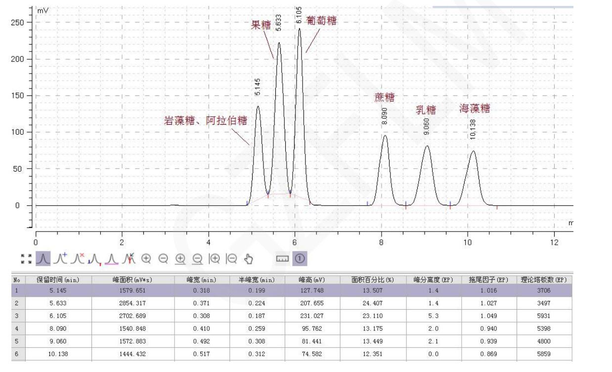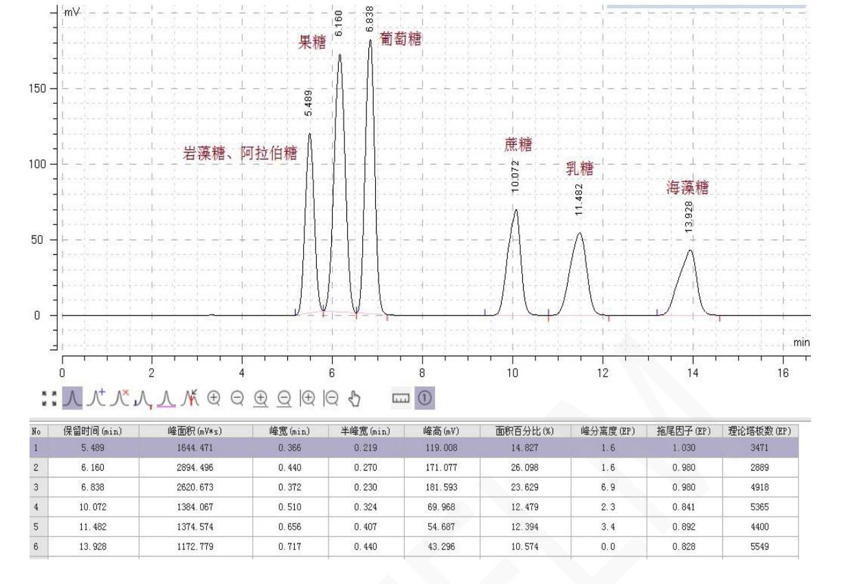方法說明:利用Comixsil HCS 對糖類化合物進行保留并分離,上述兩個條件中,使用者可根據需求進行調整,延長保留時間可以增加分離度,但同時峰型也會發生變化,需自行評估。