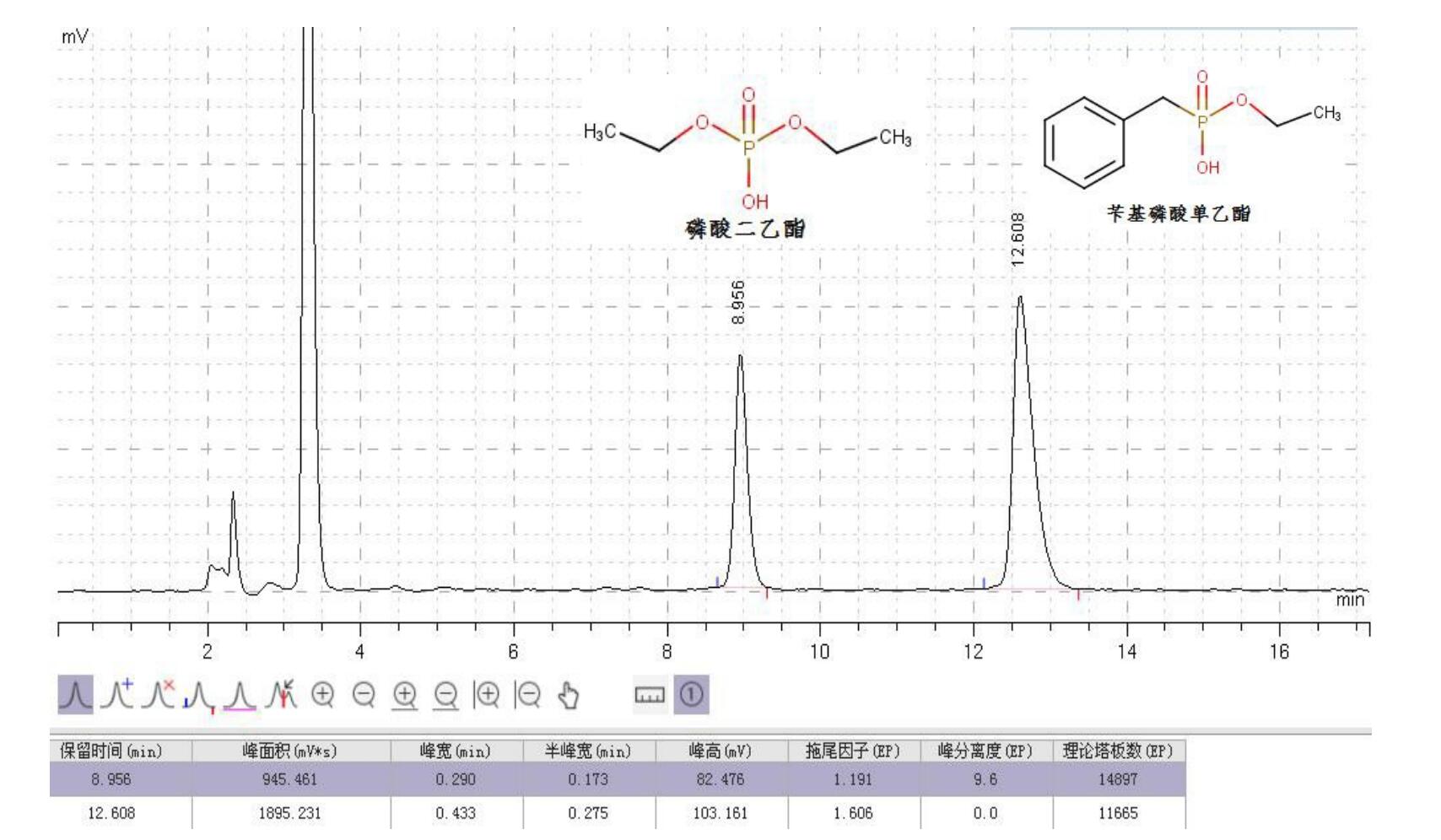 方法說明:由于兩者極性差異大,單純使用 C18 進行保留分離時,需使用大梯度,易引起基線及峰型問題, 使用 Comixsil RP-AX 的陰離子交換+疏水模式,可以較好的分離磷酸二乙酯與芐基磷酸單乙酯,該方法較好的解決了問題,且存在較大的調節空間。