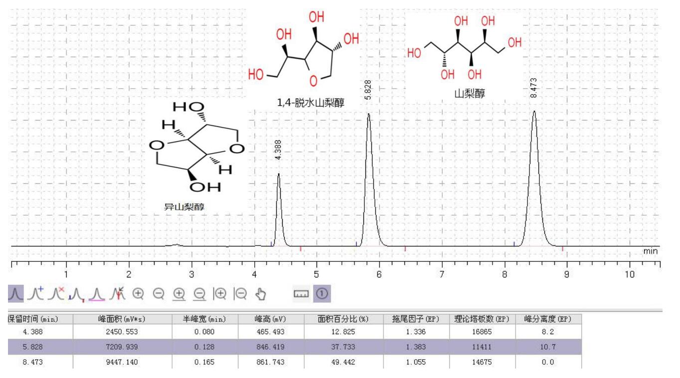 方法說(shuō)明:使用 Comixsil HCS 可以較好分離山梨醇、異山梨醇、1,4-脫水山梨醇,方法存在調(diào)整空間大, 該等度洗脫方法可適用于 RID。