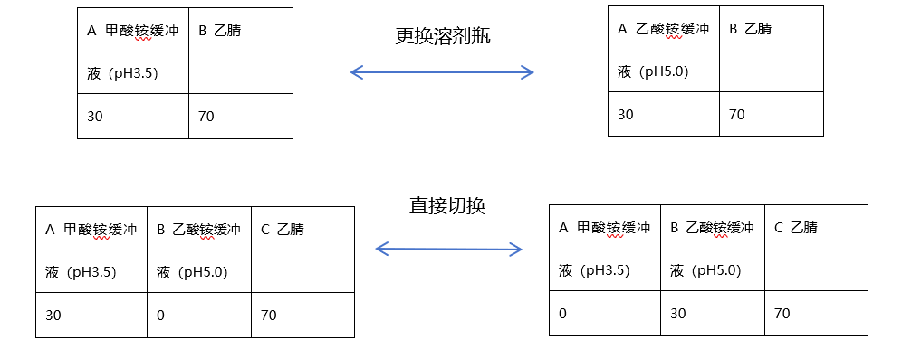 Part 2 三元泵相比二元泵的優(yōu)勢 1. 便于對比不同種類或pH的流動相 在開發(fā)一個新的分析方法時,通常需要篩選不同的溶劑組合以找到最佳分離效果。例如,可能需要嘗試: 不同pH的緩沖液:比如甲酸銨緩沖液(pH3.5)和乙酸銨緩沖液(pH 5.0)。 不同的有機相:比如甲醇和乙腈,它們的洗脫強度和選擇性不同。 對于二元泵,如果你想從“乙腈-甲酸銨緩沖液(pH3.5)”切換到“乙腈-乙酸銨緩沖液(pH 5.0)”,你必須手動更換泵B的溶劑瓶,并從泵A的瓶子中倒掉舊的緩沖液,更換新的緩沖液。這需要停機、沖洗系統、重新平衡,非常耗時且容易出錯(如產生氣泡、殘留污染)。