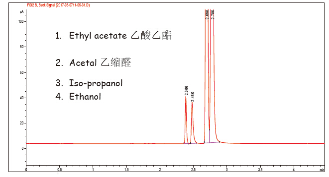 結論:白酒中一項主要考察指標,乙酸乙酯與乙縮醛在 FB-Wine 氣相柱上可以很容易在 50 ℃左右達到基線分離.