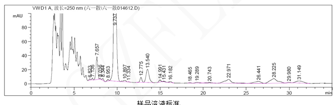 中國藥典規(guī)定理論塔板數(shù)按甘草酸銨應不低于3000,本試驗實際測出柱效為6143。